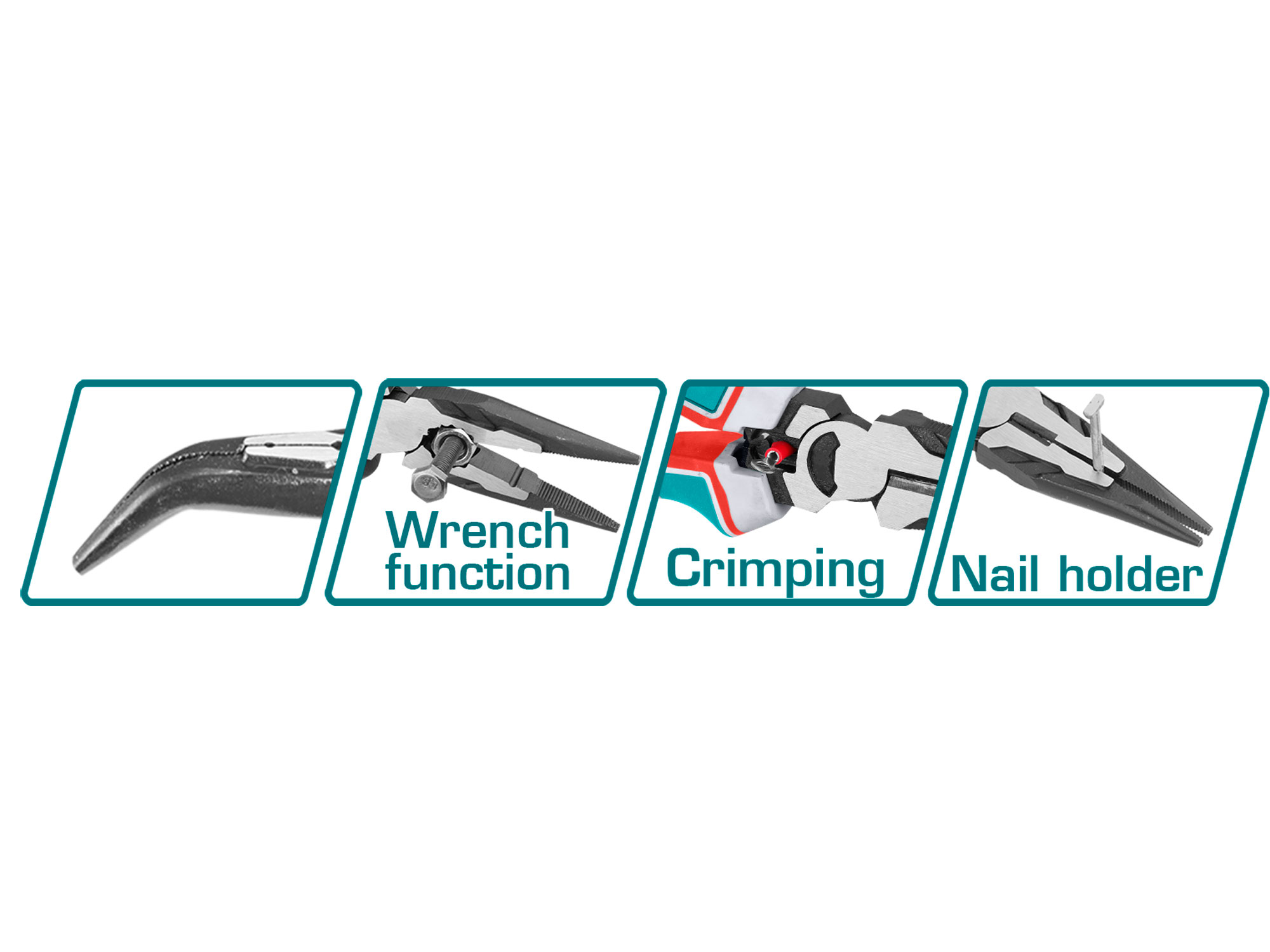 Total I tillegg til standardfunksjonene har den bøyde halvrundtangen også en krympefunksjon, en spikerholderfunksjon og en fastnøkkelfunksjon. Disse tilleggsfunksjonene gjør tangen til et enda mer verdifullt verktøy som hjelper deg med å utføre en rekke oppgaver på en mer effektiv måte.