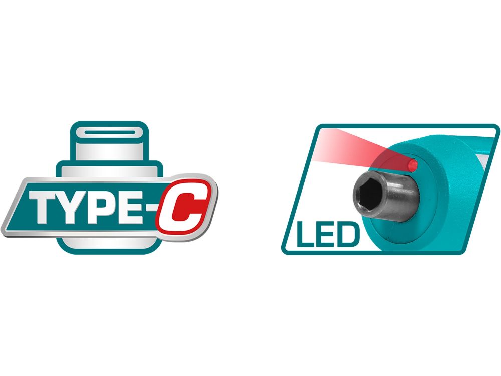 - USB-lading - Med TOTAL bitsett - LED-belysning - Momentbryter og LED-indikator for dreiemoment - Rotasjon med og mot urviseren - Kompakt og hendig designLeveringsomfang: