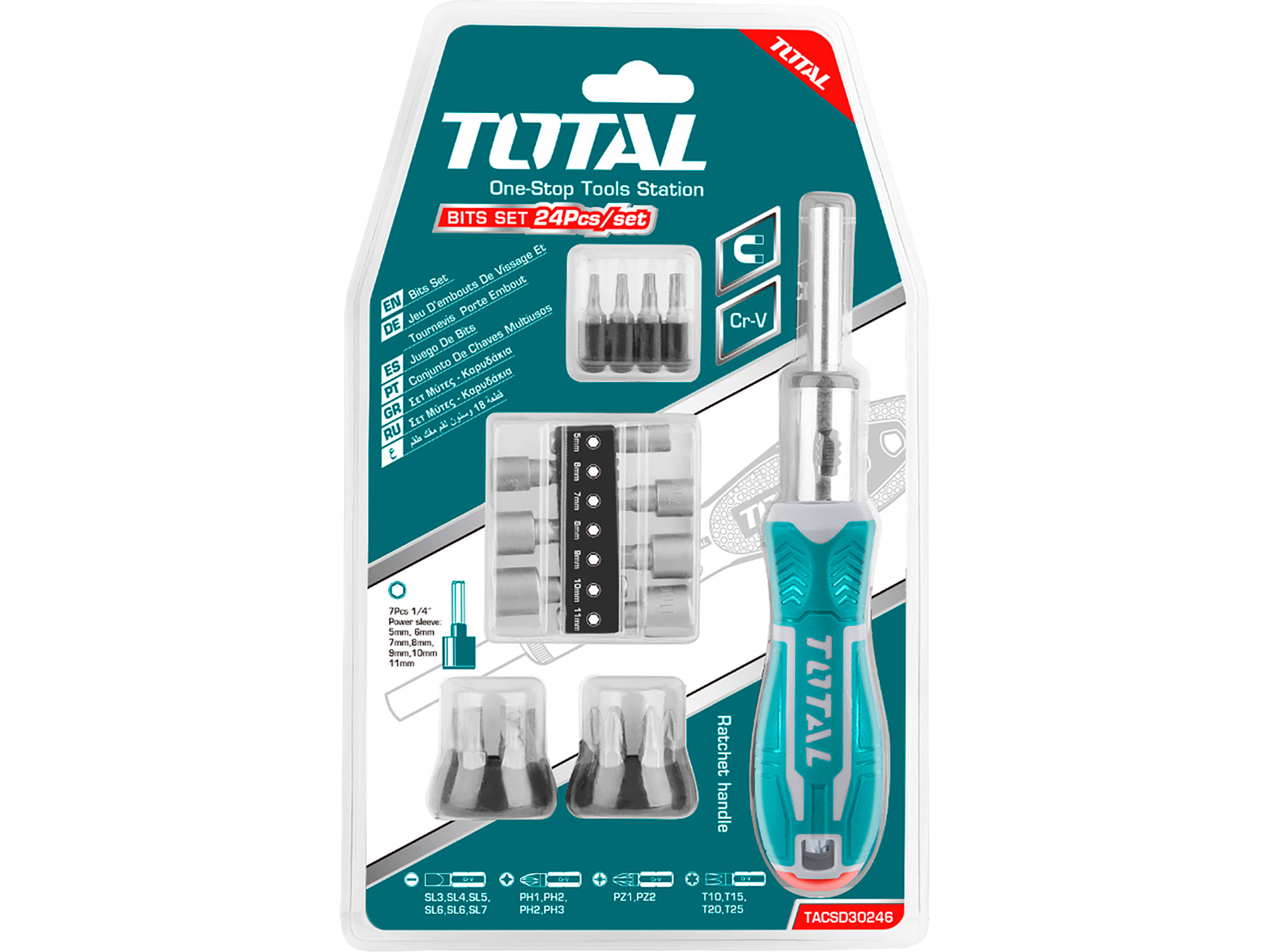 Total Skrutrekkere med skralle og spisser, sett med 24 stk.